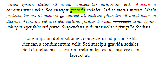 - Character styling: bold, italic, underline, sub/super scripting, vertical positioning, foreground and background color, character spacing.